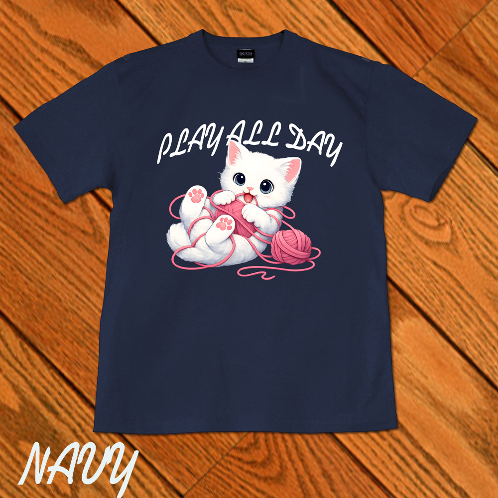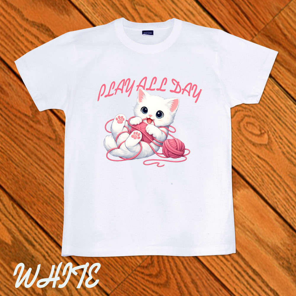 GENJU 可愛い猫 Cat キャット にくきゅう 毛糸 キュート 白猫 メンズ レディース Tシャツ 半袖 長袖 PLAY ALL DAY -白猫- 大きめサイズあり XXL XXXL 2L 3L 4L