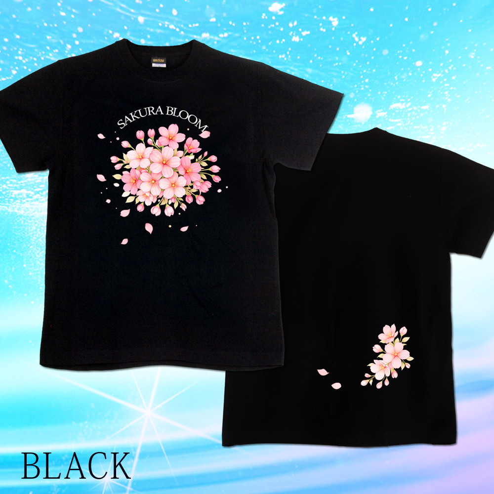 見目麗しい桜のデザインTシャツ。ブーケのような雰囲気でまとまりも良く、オプションになりますが、ラインストーン(スパンコール)を付けて豪華な雰囲気にするのも魅力的!